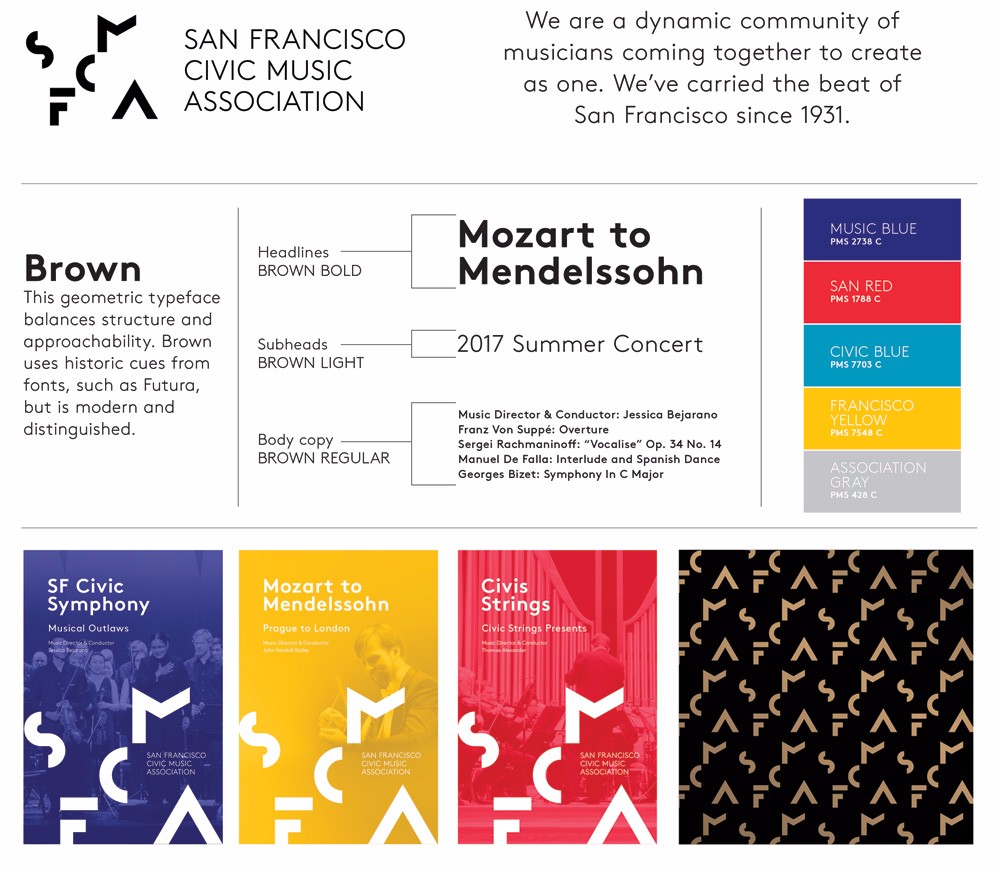 舊金山市民音樂協(xié)會(huì)本名為舊金山市民交響樂團(tuán)(SF Civic Symphony),協(xié)會(huì)期待超過交響音樂演出,并試著新的派系,因而而改名。協(xié)會(huì)能夠向觀眾發(fā)布更普遍的音樂著作,例如爵士音樂或時(shí)興音樂。全新升級(jí)的企業(yè)形象安裝這一點(diǎn),新logo設(shè)計(jì)來源于 Kristine Arth。